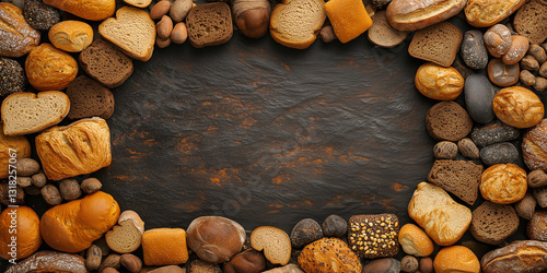 Obraz premium Draufsicht auf einen Rahmen mit Brot und mit Platz für Text in der Mitte -...