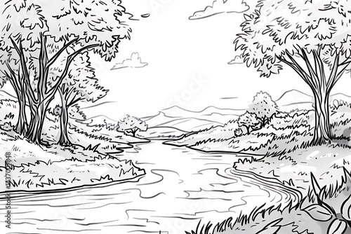 Fototapeta premium Draw a peaceful river winding through a forest using black outlines only, without adding any colors.