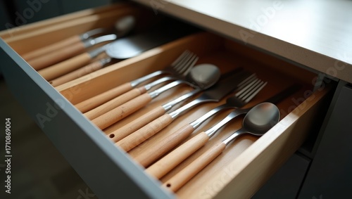 Naklejka premium Drawer with neatly arranged kitchen utensils using dividers