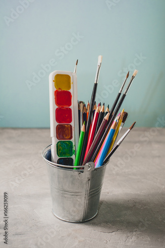 Obraz premium Drawing accessories - pencils, paints and brushes on a gray background