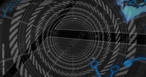 Fototapeta premium Drawing central spiral chevron rings over grid, pulling eye into virtual HUD space with blue nodes
