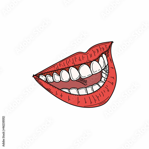 © Yana, Obraz premium Drawing, engraving, ink, line art, vector illustration laughing mouth with great teeth colored sketch in silhouette on a white background.