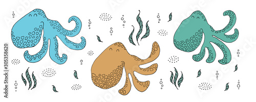 Naklejka premium Drawing - funny octopuses and hand drawn elements.