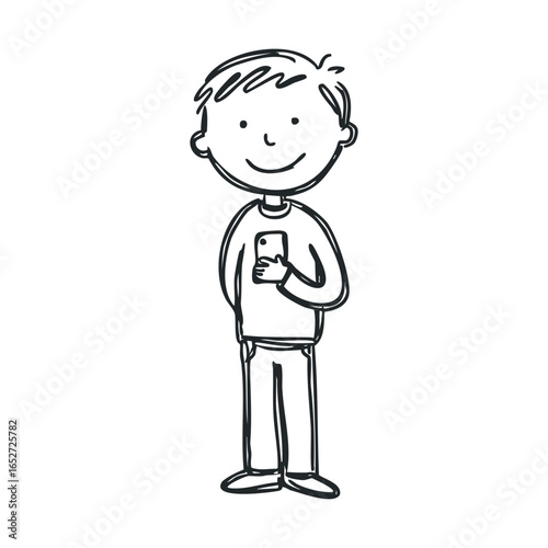Obraz premium Drawing of a cheerful boy standing with a smartphone in hand