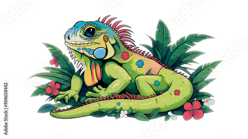 © Christian, Naklejka premium Drawing of a colorful iguana looking like a gentle dragon for a children's book illustration, on a white background. Transparent image png