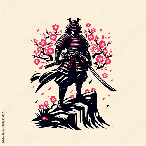© igor, Obraz premium Drawing of a samurai with a sword and pink sakura flowers.