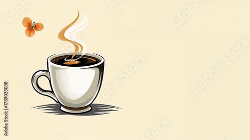 © Alex, Obraz premium Drawing of a steaming coffee cup on a light beige background, logo-styled with copy space for text