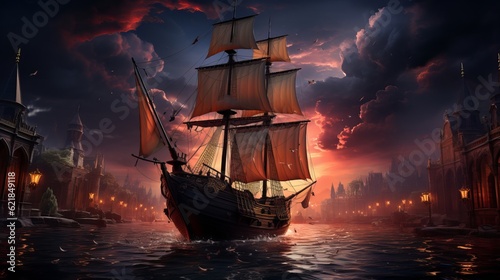 © Dzmitry, Obraz premium Drawing of an old sailboat on the waves Generative AI