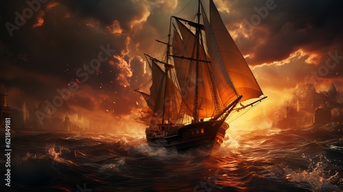 © Dzmitry, Obraz premium Drawing of an old sailboat on the waves Generative AI