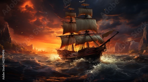 © Dzmitry, Obraz premium Drawing of an old sailboat on the waves Generative AI