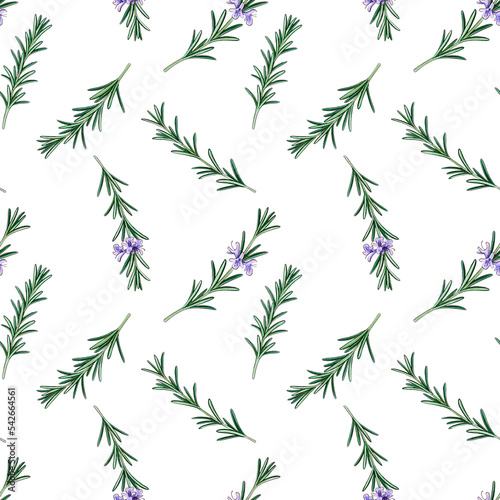 © cat_arch_angel, Naklejka premium drawing seamless pattern with rosemary with flowers and green leaves, Salvia rosmarinus, medicinal plants, aromatic herbs, hand drawn illustration