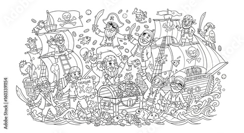 Fototapeta premium Drawing to paint pirate ship coloring page with treasure chest and pirates...