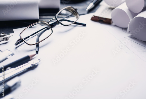 Fototapeta premium Drawing tools or office stationery. compasses and blueprint