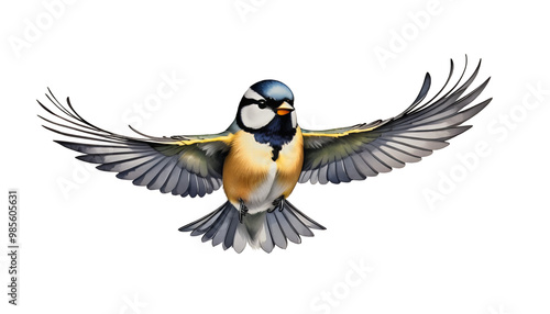 © akk png, Naklejka premium drawing watercolor tit flight bird isolated hand white illustration drawn bird watercolor nature tit colourful animal titmouse drawing paint wildlife wing feather flight background vignetting painted