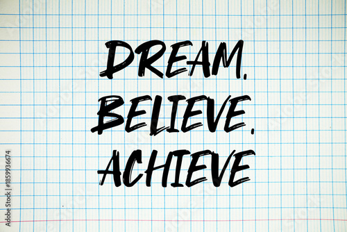 © may1985, Naklejka premium Dream, Believe, Achieve text written on white notebook sheet with grid