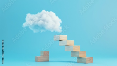 Fototapeta premium Dream big symbol in wooden blocks staircase to clouds on blue background Aim high to reach aspirations