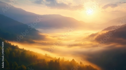 Fototapeta premium Dreamlike fog drifting over a peaceful mountain valley at dawn, illuminated...