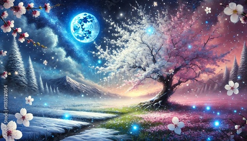 Obraz premium Dreamlike Harmony of Snow and Cherry Blossoms Under Tranquil Blue Moonlight