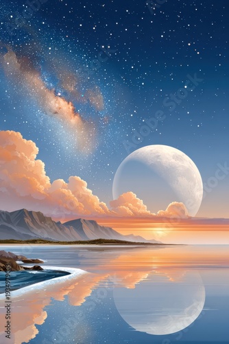Fototapeta premium Dreamlike night sky over a tranquil coast with a giant moon, stars, and Milky...