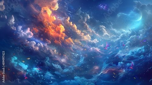 Obraz premium Dreamlike ocean with glowing, colorful waves and magical sea creatures