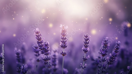 © Chaikit, Naklejka premium dreamlike perspective of lavender field from ground level, macro lens with minimal focus creating abstract patterns, violet flowers melting into ambient purple fog, dancing golden particles of pollen