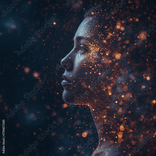 Fototapeta premium Dreamlike portrait of a figure dissolving into stars — visual metaphor of...