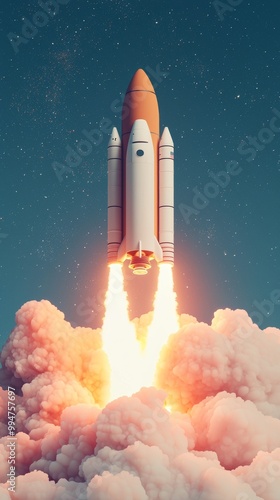 © pattaphorn, Obraz premium Dreamlike Rocket Launching into Space Amidst Clouds