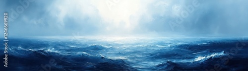 © Mariya, Fototapeta premium Dreamy abstract blue background with serene white haze border and textured grunge bottom in soft pastel shades