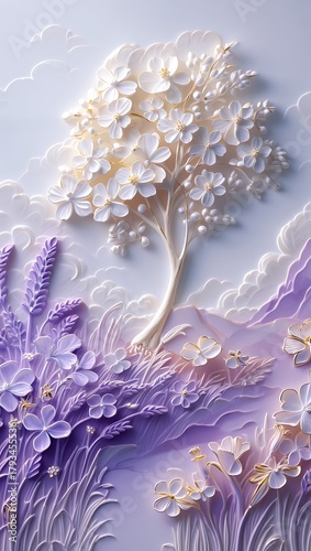 © SY_designHouse, Naklejka premium Dreamy Blossom Tree with Lavender Field in Pastel Colors Illustration