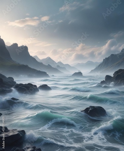Fototapeta premium Dreamy blue hazy landscape with undulating waves and misty sky, soft focus,...