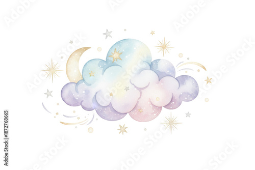 Fototapeta premium Dreamy celestial watercolor illustration featuring crescent moon, cloud, and twinkling stars design