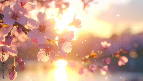 © ikwal, Fototapeta premium Dreamy Cherry Blossom Branch Against Golden Sunlight Sky in Springtime Landscape