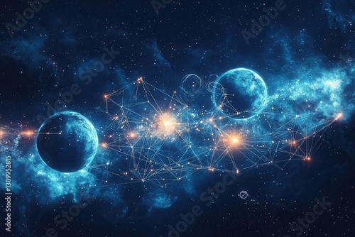 Obraz premium Dreamy cosmic landscape with planets and glowing connections under a deep blue nebula in a magical celestial setting