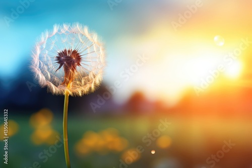 © Margarita Ratatosk, Fototapeta premium Dreamy dandelion at sunset. Fragile beauty of nature. Blurred meadow background with warm light. Wish and hope concept. Inspirational summer landscape for wallpaper