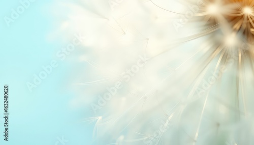 © Muksuthida, Naklejka premium Dreamy dandelion seed head with delicate details against a soft pastel blue background, creating a calming and ethereal composition