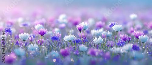 Naklejka premium Dreamy field of blooming wildflowers in shades of purple, blue, and white, with soft morning light and sparkling dew drops creating magical, tranquil atmosphere