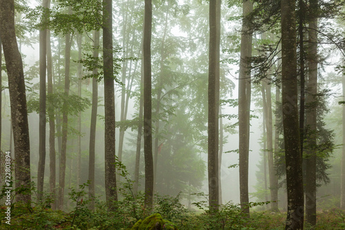 Naklejka premium Dreamy foggy green broadleaf forest landscape.