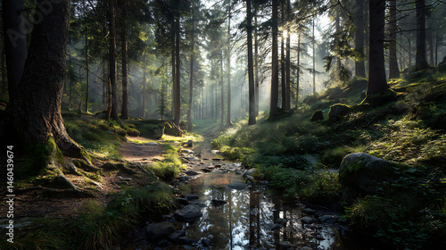 Obraz premium Dreamy forest landscape with a small creek and sunlight shining through the...
