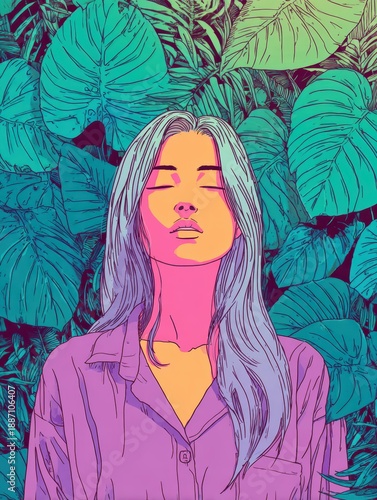© Sagar, Fototapeta premium Dreamy Girl Surrounded by Lush Tropical Foliage, Meditating Peacefully