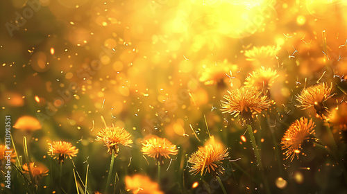 Fototapeta premium Dreamy golden dandelion field glowing in soft sunlight with floating particles
