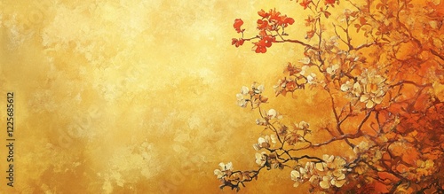 Fototapeta premium Dreamy golden landscape with floral textures in watercolor style creating a serene atmosphere and ample space for text insertion.