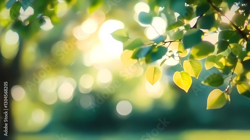 Obraz premium Dreamy Green Leaves with Sunlight and Blue-Green Background