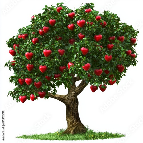 Fototapeta premium Dreamy heart-shaped apple tree with vibrant red fruits surrounded by lush...