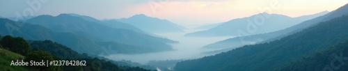 © Chanchai, Fototapeta premium Dreamy landscape with misty mountains and valleys, calm, mist, valleys