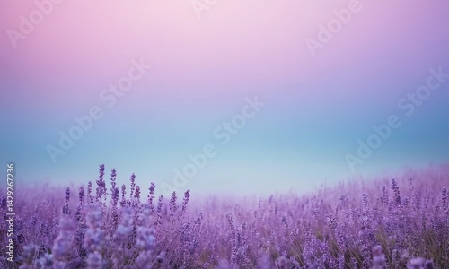 Naklejka premium Dreamy lavender field under a soft pastel sky creates a tranquil scene