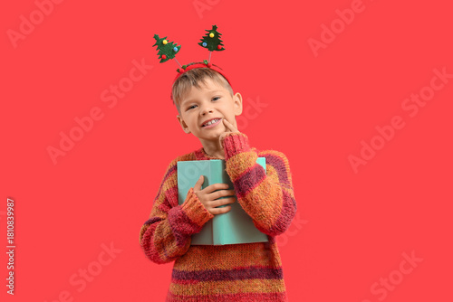 Naklejka premium Dreamy little boy with book on red background. Christmas celebration