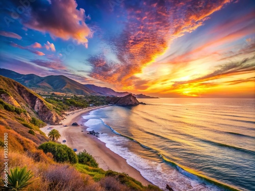 © kittipon, Fototapeta premium Dreamy Malibu Sunset: Pastel skies, silhouetted mountains, calm seas, romantic, enchanting