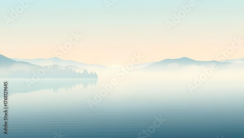 © vionaang, Fototapeta premium Dreamy Misty Lake with Soft Light Reflections