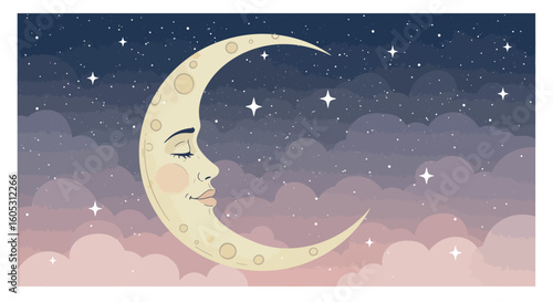 © Mark, Naklejka premium Dreamy moon with face amidst night sky and twinkling stars