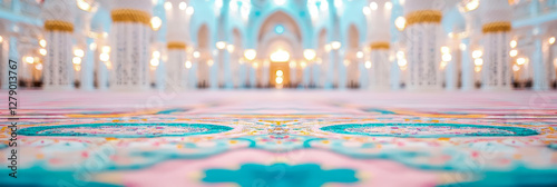 Obraz premium Dreamy Mosque Interior: A serene sanctuary with intricate carpet floor and soft, glowing lights